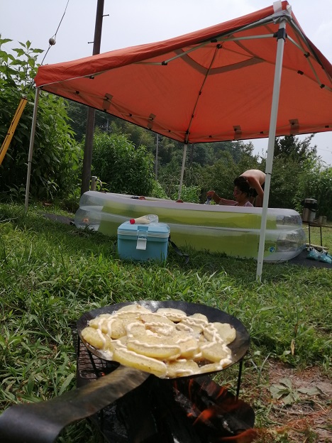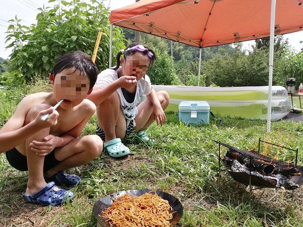 子供達がプールで遊んでいる間に昼食の準備。炎天下でも焚火で調理しちゃいました。