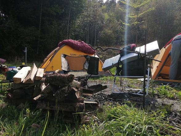 長男はテントの設営に苦労していますが、私は今は無き名品「GORE LIGHT(2018年終了)」なのでサクッと設営して焚火の準備にとりかかります。