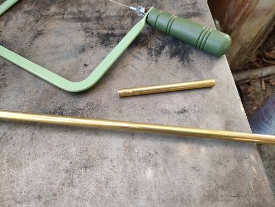 まずは真鍮パイプを100mmでカットします。グラインダーでカットしてもいいのですがパイプなので糸鋸でゆっくり切って潰れを回避します。