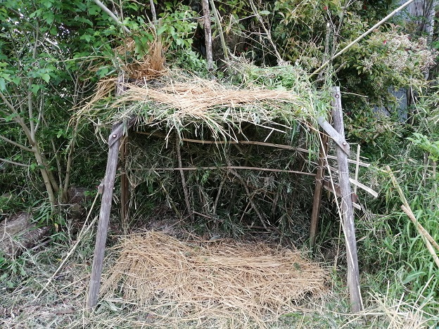 竹を切ってきたり、枯れ木を切ったりして屋根の骨組みや壁を作り、刈った草と藁を使って何となく秘密基地っぽくなっています。