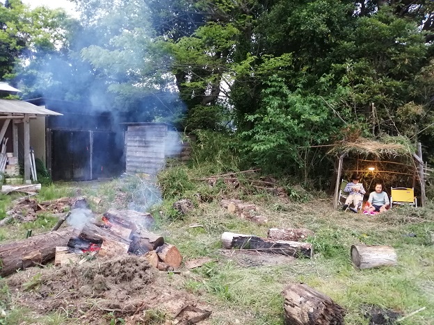 小屋にあったブルーシートでバージョンアップされていました。壁も藁でしっかりしたものが出来ていました。おまけに、ウッドガスストーブにも火が付いていました。