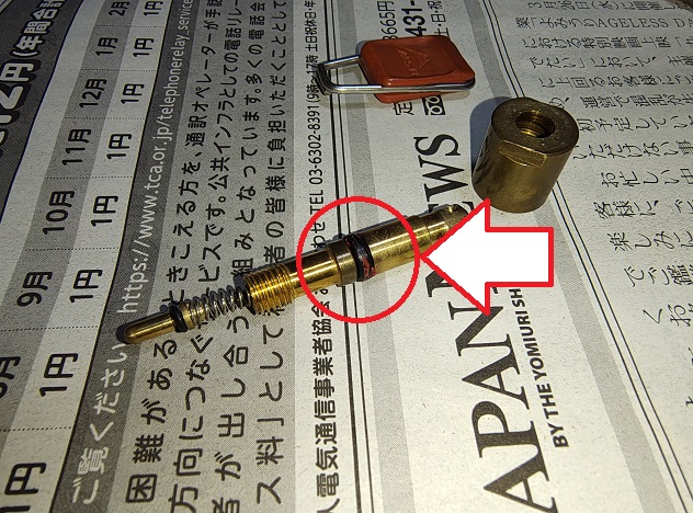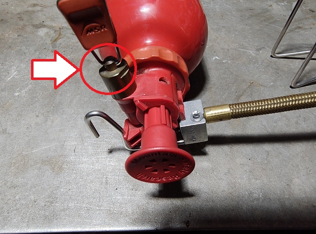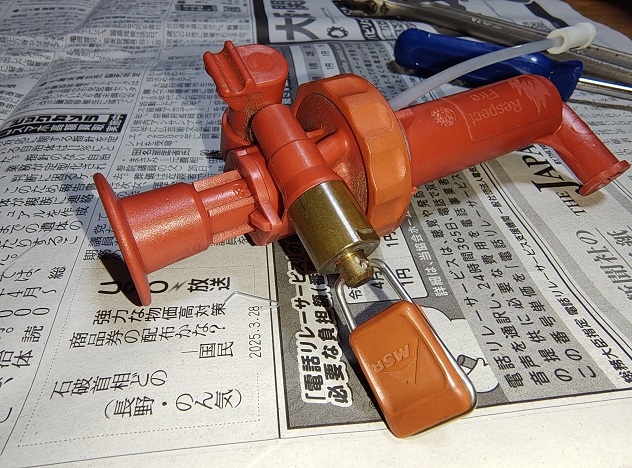 バルブ付近から燃料が漏れています。困った、ケロシンなら取り合えず燃焼させてもよかったのですが、相手がホワイトガソリンだったので、いそいそと片づけをして、正規販売店「株式会社モチヅキ」からパーツを取り寄せることにしました。