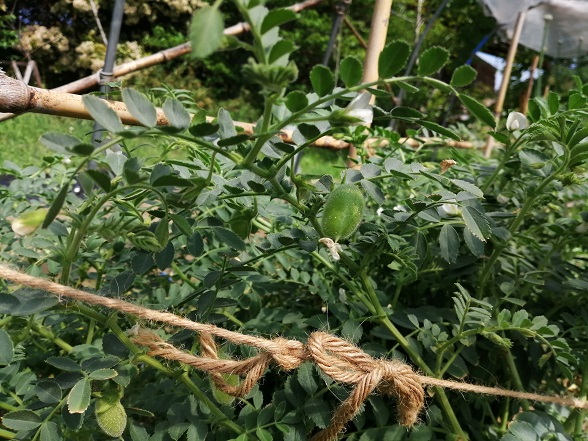 今年初挑戦中の「ひよこ豆」。どの様な形で成長して収穫に至るか良く分かっていない中での栽培ですが、今のところ順調?に成長しているようで、小さな莢が出来始めています。