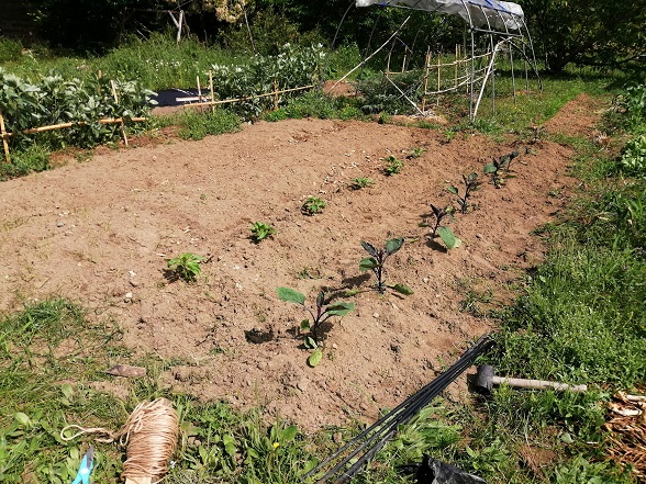 続いて行灯仕立てで寒さから守られていた夏野菜も、この陽気ですので、行灯を取り除き支柱を立てる作業を行いました。