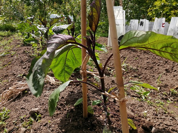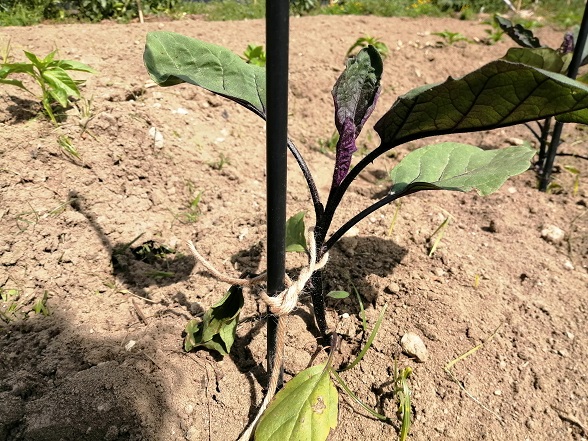 続いて、砂地に植えてある「ナス」と「ピーマン」にも支柱を立てます。