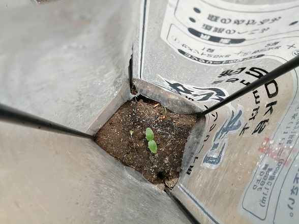 きゅうりはあまり大きく苗を育てると、その後の成長が芳しくないので(我が家の場合)まだ子葉の時に植えつけて行灯をかけ「うりはむし」の食害に備えます。