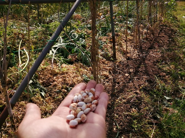 最後に昨年種取して増やした「虎豆うずら(インゲン)」を植えつけて本日の作業は終了です。