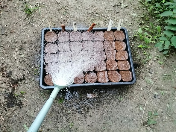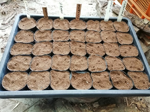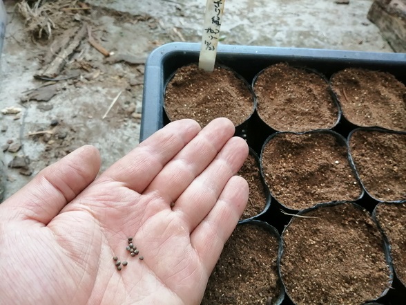 種は1ポットに付き2粒蒔きます。2粒とも発芽しても分離して2株で植えることができるので、全部発芽したら大変な事になるんですけど、発芽しないポットがあると寂しいので、毎回2粒づつ蒔きます。古い種は3粒蒔くこともあります。