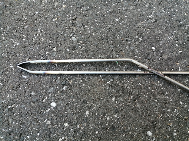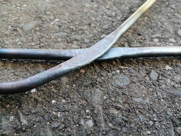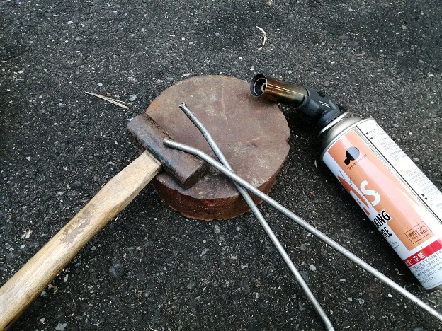 もっと強度の強い鉄材だと歪むことも無くなるのかもしれませんが、ホームセンターで簡単に手に入る丸棒だと叩いて薄くなった部分の強度はどうしても落ちてしまいます。