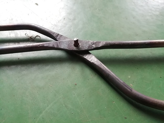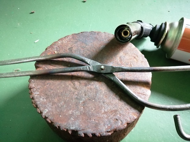 写真ではほぼ完成に近づいていますが、このまま薪を挟むと、叩いて薄くなっている稼動部が柔らかいので曲がってしまい、薪を掴むと毎回手直しが必要なので、できるかどうか分かりませんが焼きいれしてみるとことしました。