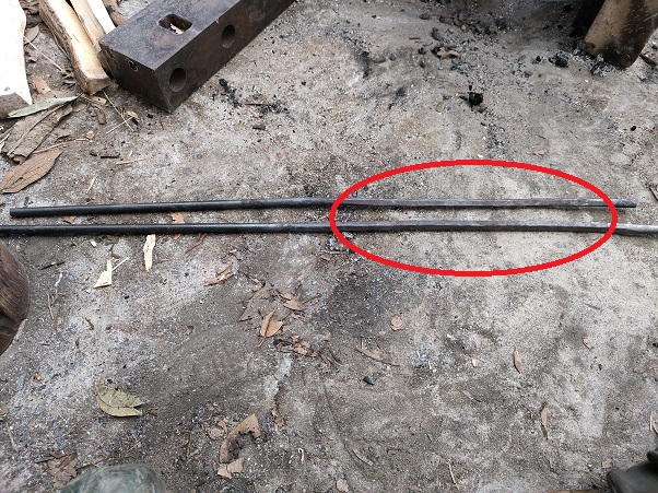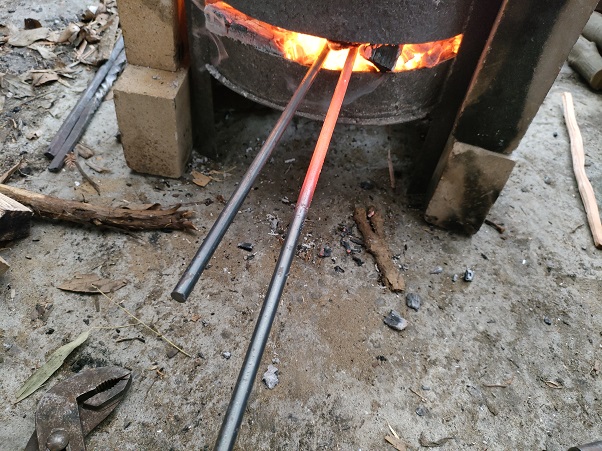 写真のように丸棒は焚き火の炎であっても真っ赤に加熱することが可能です(送風あり)。