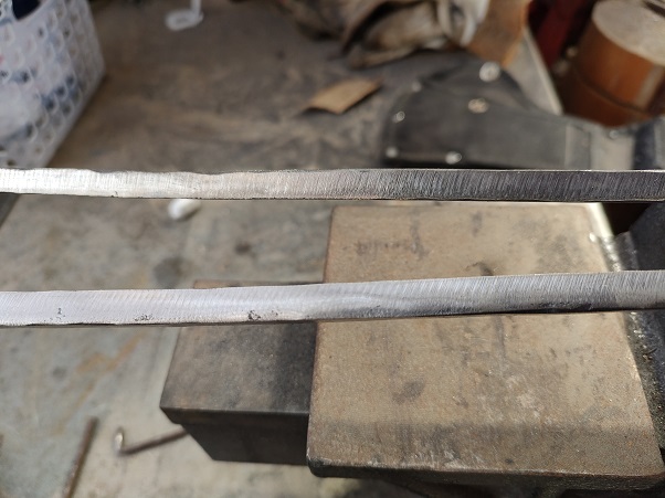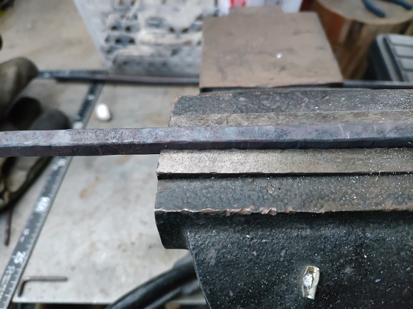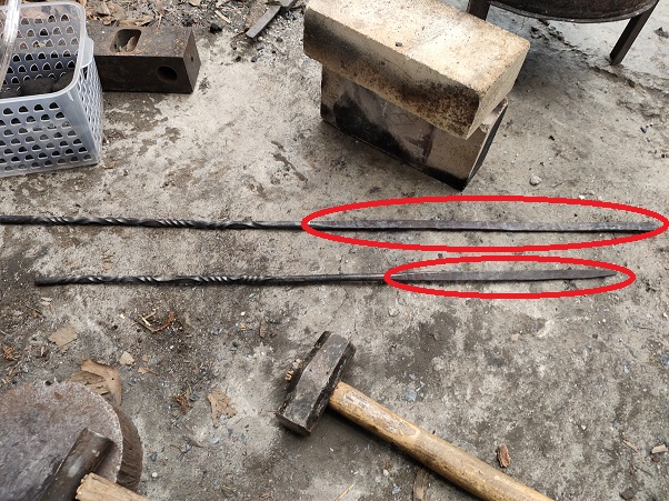 この丸棒を薄く延ばす作業が結構きつかったです。1本は30cm、もう1本は20cmほど薄くするのですが、ハンマーでコツコツ叩くの中々先に進みませんでした。