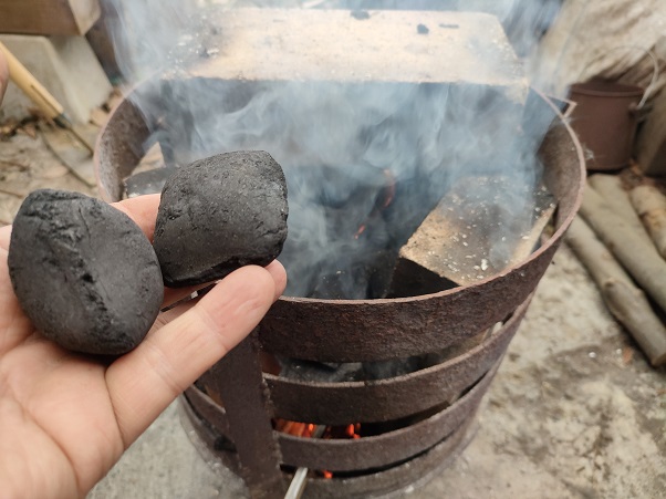 格安ブロワーを使って豆炭を熱して持ち手部分の丸棒を過熱します。