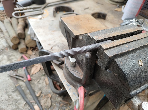 熱した角部分は万力に挟んでツイスト加工を行います。