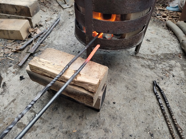 いつものように自作焚き火台を耐火レンガで囲って温度を上げながら丸棒を加熱します。