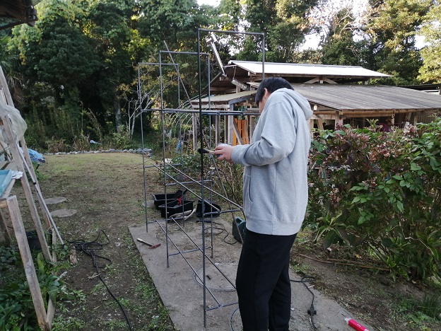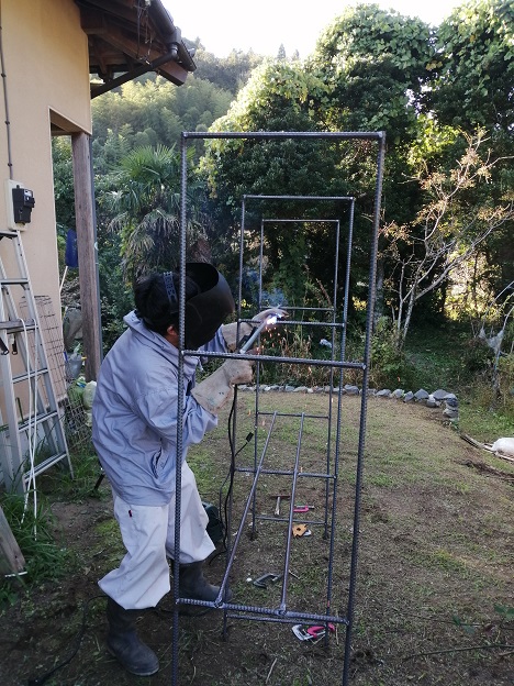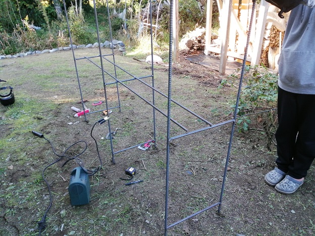 先ほど作った、3つの足(側面)を写真のように立てて、薪置きとなる鉄筋を溶接していきます。これで、3つの足がしっかり固定されて自立するはずです。が、この状態に溶接するのは結構難しかったです。長男に手伝ってもらいましたが、直角を出すのが難しいし、グラグラ揺れてしまい、この方法はちょっと失敗かなって途中で思ってしまいました。