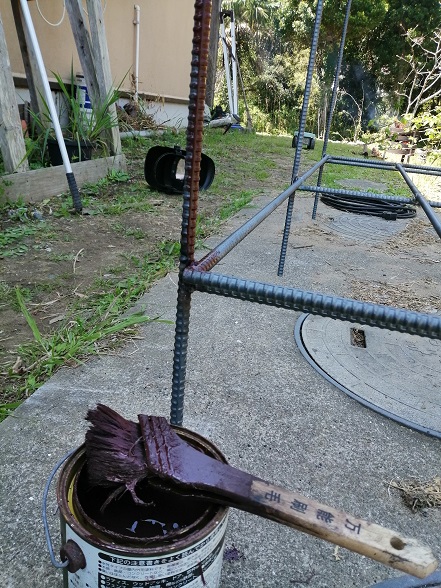 ペンキが乾燥するまで、垂木にも塗装します。こちらは油性でした。