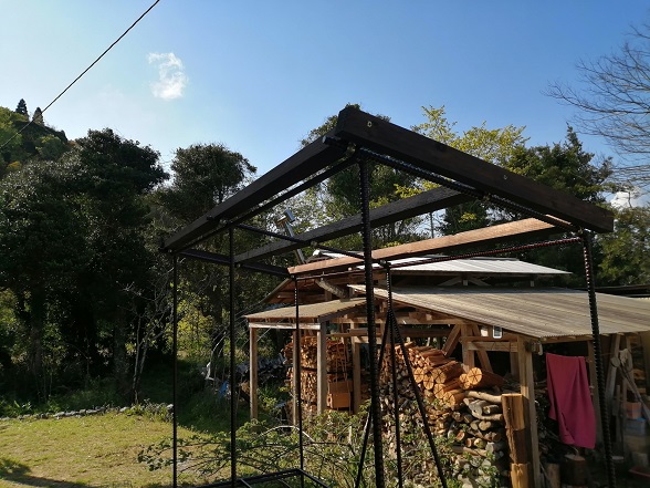 野積みしている薪も、写真の状態ではなく、高さ180cmほどとなり満タン状態。なのに薪になる木が沢山あるので、野積みスペースを増やすと共に屋根付きの薪棚を格安で作ることにしました。