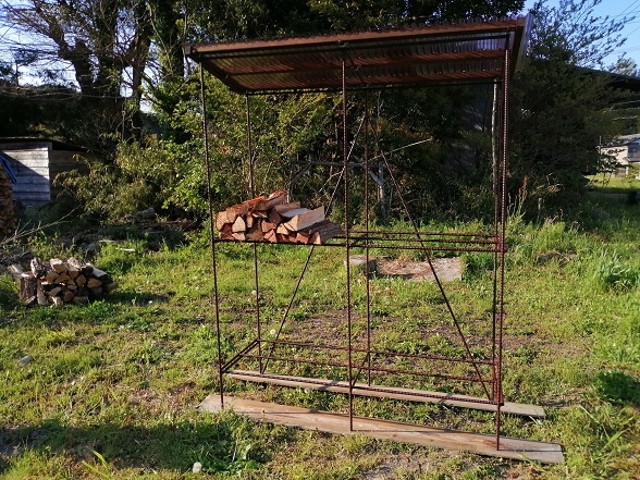 筋交いの効果でグラつきもありませんから、薪程度を乗せるなら単管よりも安い異型鉄筋で十分だとは思っています。