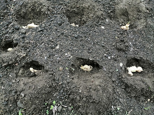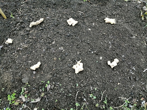 先日、大しょうがを植えつけた場所の空いているスペースに7片のしょうがを植えつけます。