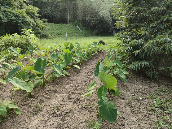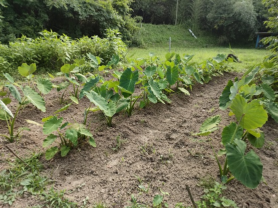 成長にばらつきのある里芋。1回目の土寄せは行なっており、7月中に2回目の土寄せを行います。