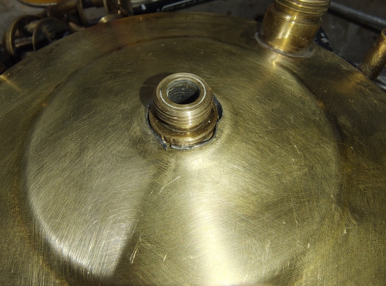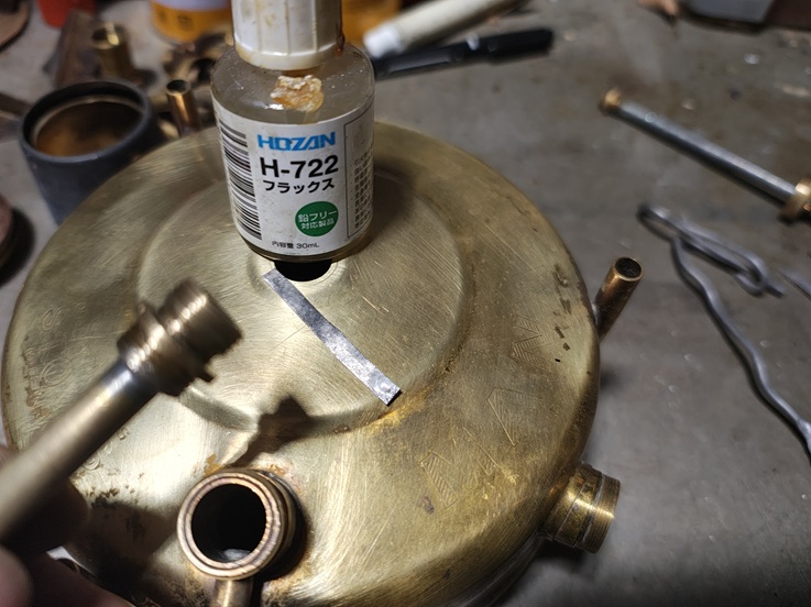 タンク上部との隙間にも薄く伸ばした、半田を押し込んだら、バーナーを使って半田付けします。