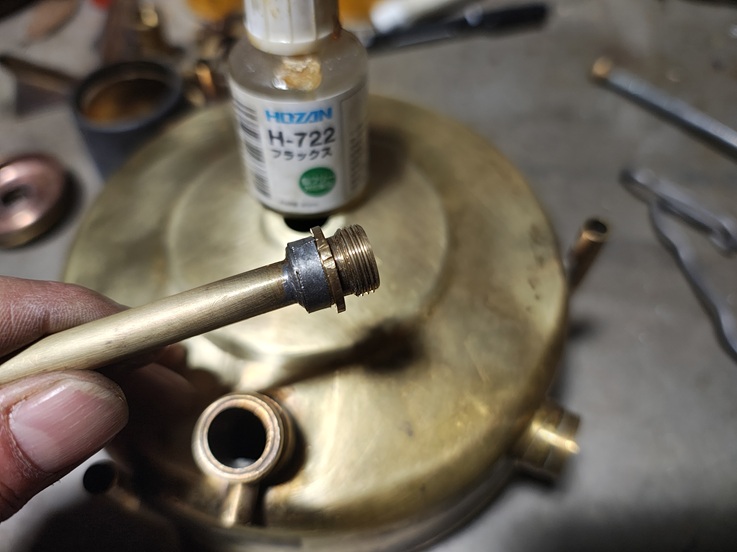 この下のチューブが半田付けなので、ロウ付けするとなるとこの部分もロウ付けする必要があるので、まずは半田で直してみて、やっぱり強度的に弱ければ全部ロウ付けしなおすことにします。