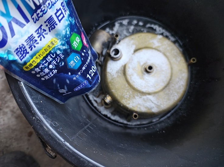過炭酸ナトリウム(オキシウォッシュ)を使って、タンク内などの汚れを取り除きます。