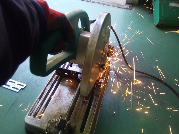 高速切断機でカット、火花が頭に飛んでくると結構熱いので帽子着用必須です。