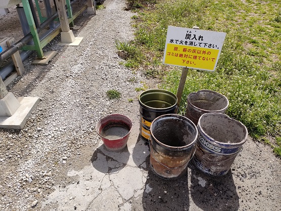 炊事場手前には「炭入れ」があり焚き火の灰や残った炭を捨てることができます。その際、火が残っている場合は水でしっかり消火しましょう。