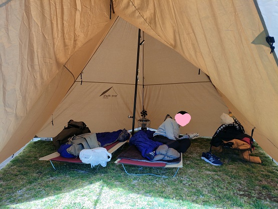 テントもタープもサクッと設営できるタイプですので、ここまで1時間もかからず完成です。