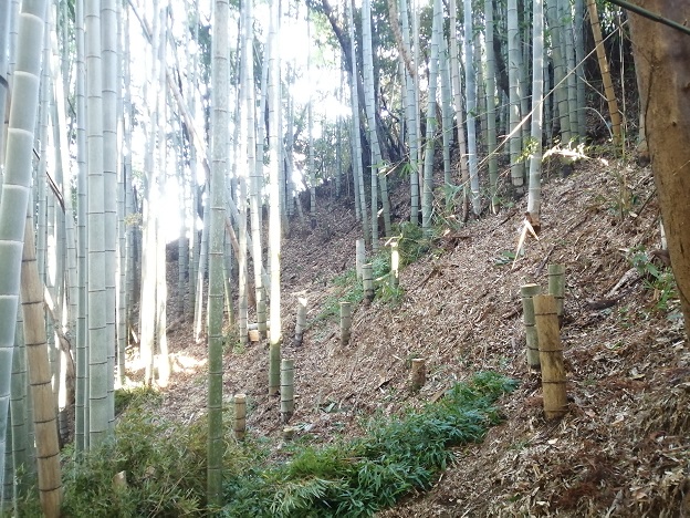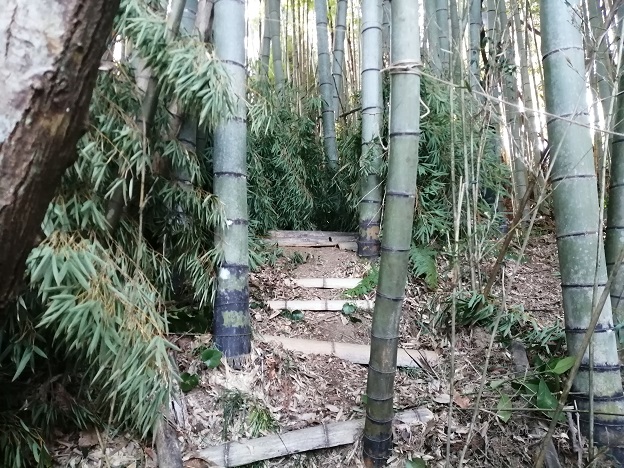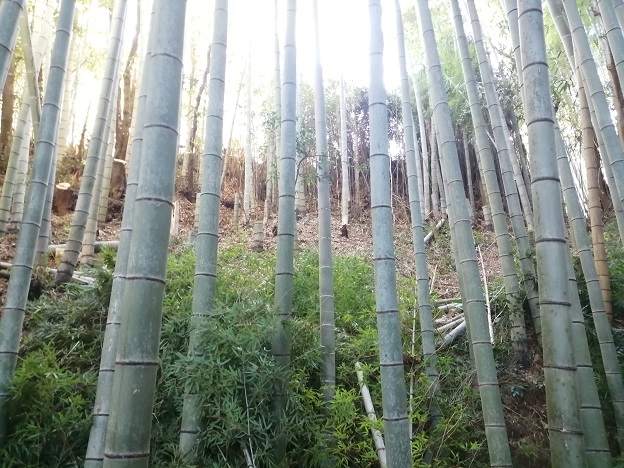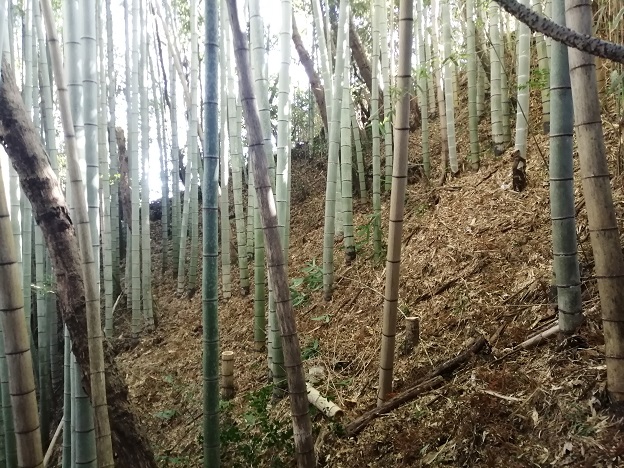 今日はこの斜面の竹を可能な限り切り倒します。が、太い孟宗竹ばかりなのでどうなるでしょうね。