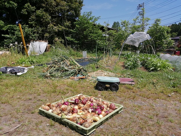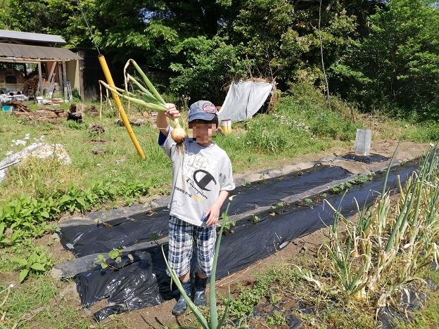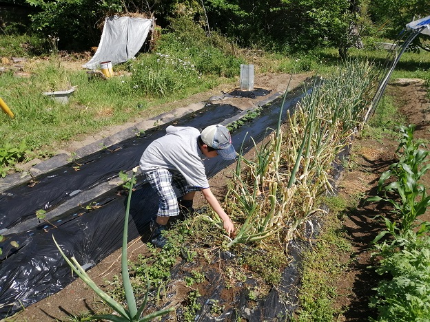 そんな、夏のような気温の休日、早生玉ねぎの収穫を次男と行いました。