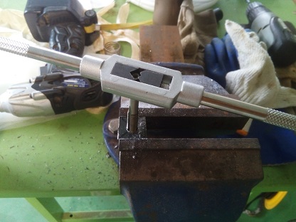 次にねじ切りタップを使ってフラットバーにネジを切ります。