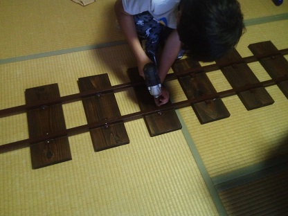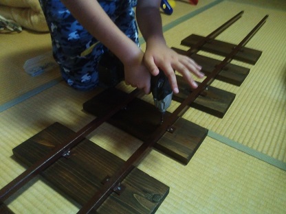 組み立てといってもビスで杉板を留めるだけなので、長男にお願いしてみました。
