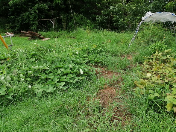 まずは写真のような状況なので大きく茂った雑草を取り除くと共に伸び伸びになっているサツマイモの蔓と剥がして端に寄せます。