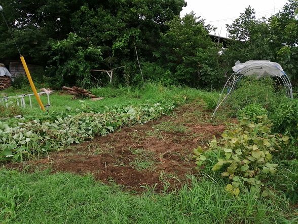 雑草を取り除き、サツマイモの蔓を端によけてキャベツや白菜を定植するスペースを確保。
