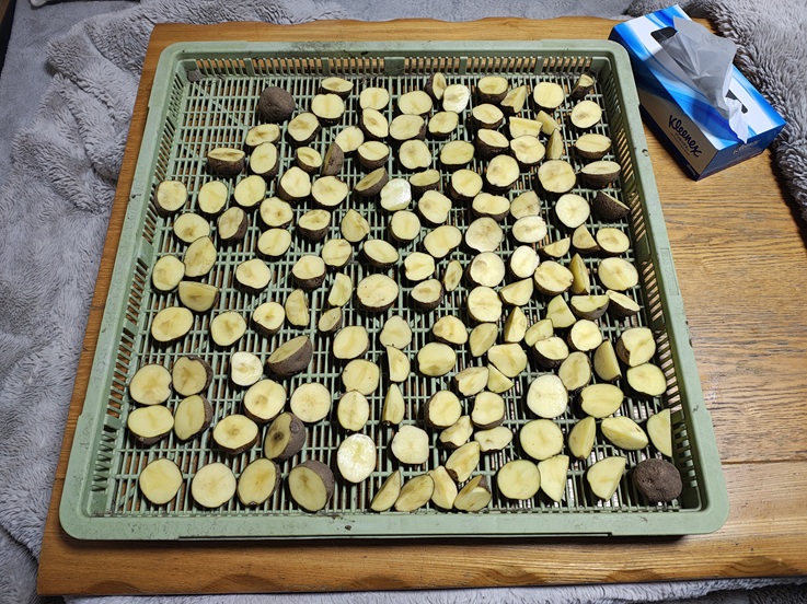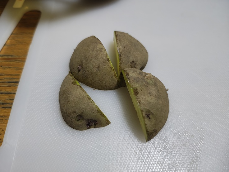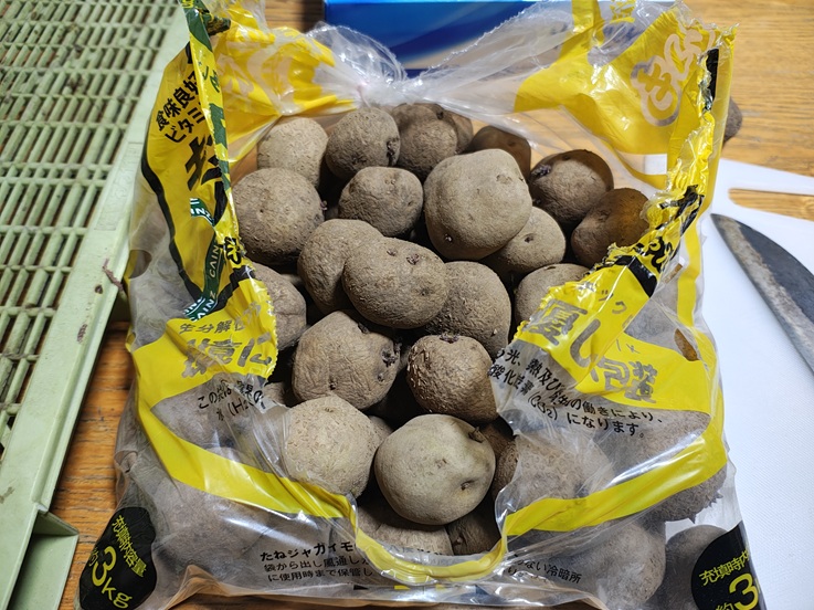 仕事から帰った金曜日の夜。明日の植え付けに向けて種芋の準備(カット)をします。