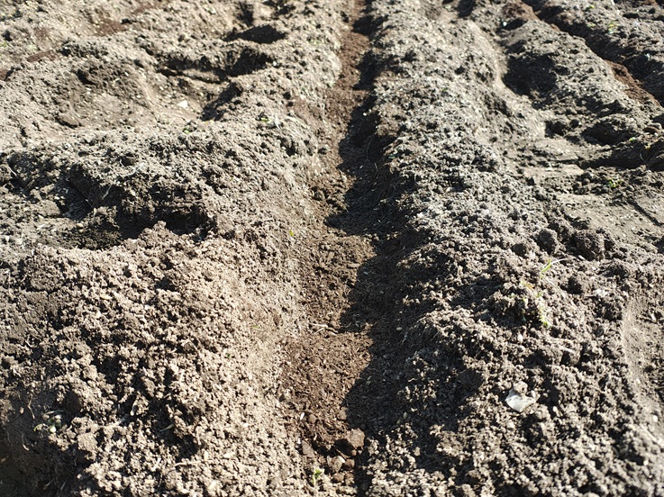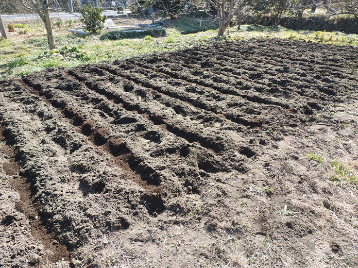 朝1度耕した畑。凹んでるところに種芋を置いていきます。