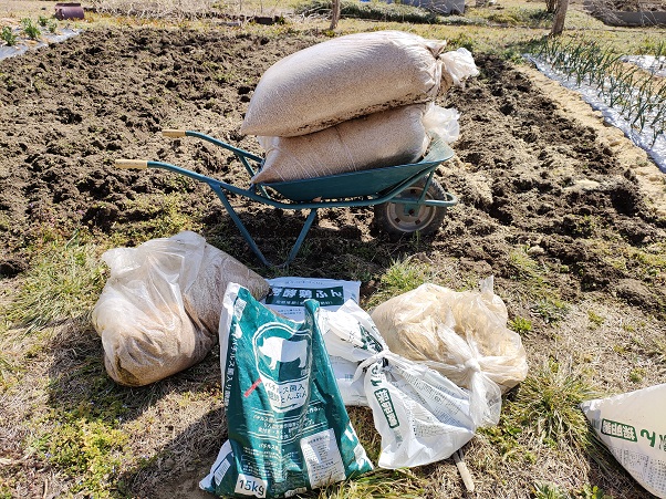 「米ぬか」「モミガラ」「鶏糞」「豚ぷん」で畑の状態を良くしていきます。本当は植付けの2週間前ぐらいに行うの良いんでしょうけど、私は大体当日に畑の準備をしていますが、今のところ十分な収量が得られているのでしばらくは今のまま栽培を楽しむつもりです。