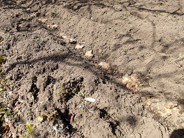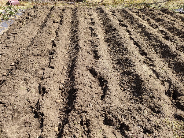 耕運機で耕すと溝ができるのですが、その溝を上手に活用して、じゃがいもは溝植えしています。