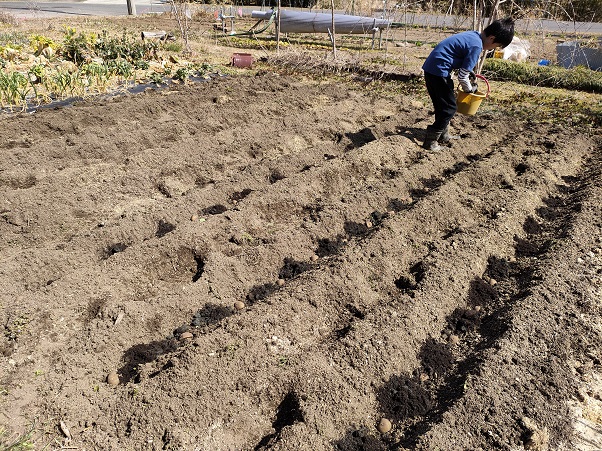 次男が堆肥を入れてくれている間に、私が軽く土を被せたらじゃがいもの植え付け完了です。