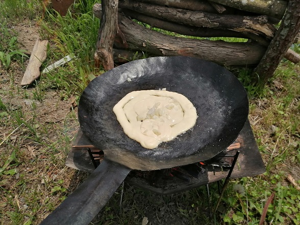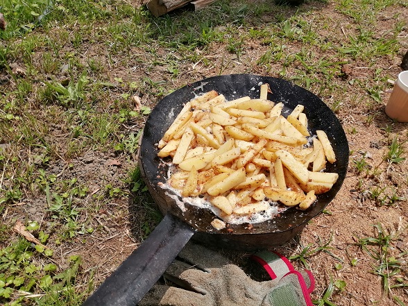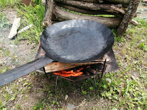 長男に用意してもらっておいた焚火に自作フライパンをのせて、しっかり加熱します。
