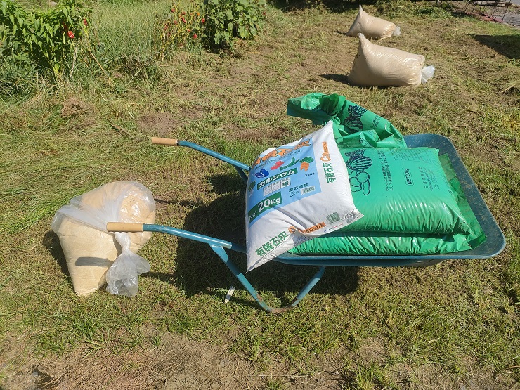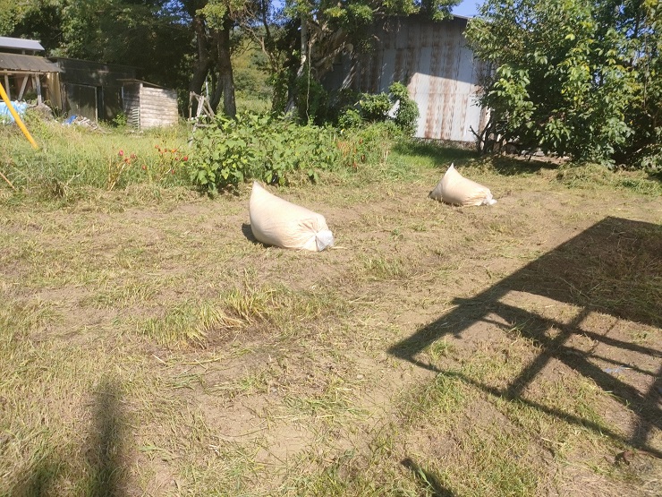「米ぬか」「鶏糞」と今年こそは玉ねぎ栽培成功させる為の秘策「有機石灰」をしっかり畑にばら撒きます。