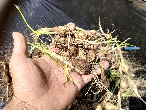 今年は掘り出して即植えつけます。例年、6月に収穫して小屋に吊るしておいたのですが、植え付ける時期になると乾燥でなのか何個かは必ずスカスカになってしまうので、畑に放置していたのですが、今年は1つもスカスカになっていなかったので、植えつける種分は畑に残しておいたほうが良さそうです。