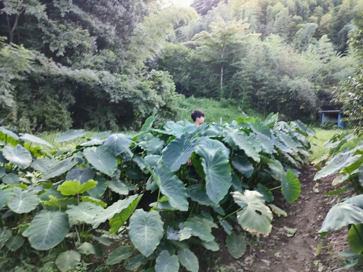 最後に里芋の様子をチェックしに裏の畑に