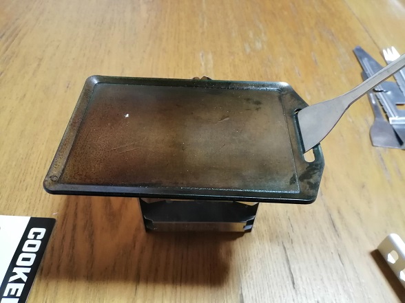 今までは「もんじゃ焼きへら」で鉄板を持ち上げていましたが、移動の際、不安定で落としそうになることが数回ありました。