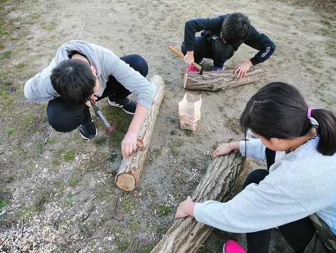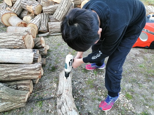 私が原木に穴を開けて、子供達が3人がかりで穴に菌駒を打ち込みますが、穴を開けるスピードより打ち込むスピードの方が速いので、煽られる煽られる。