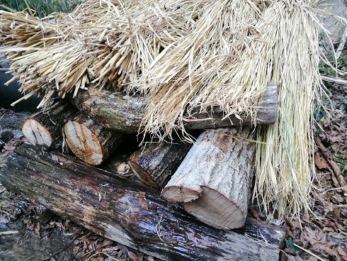 菌を打ち込んだ原木が6月まで日があまりあたらないところで、藁などをかけて保湿し、菌を原木にまわします。