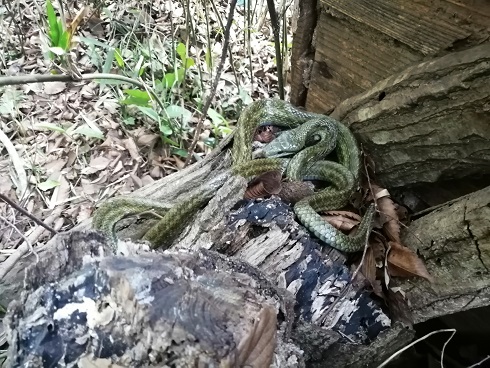しいたけの原木を置くスペースを設ける為に片付けをしていたら冬眠中のアオダイショウを起こしてしまいました。